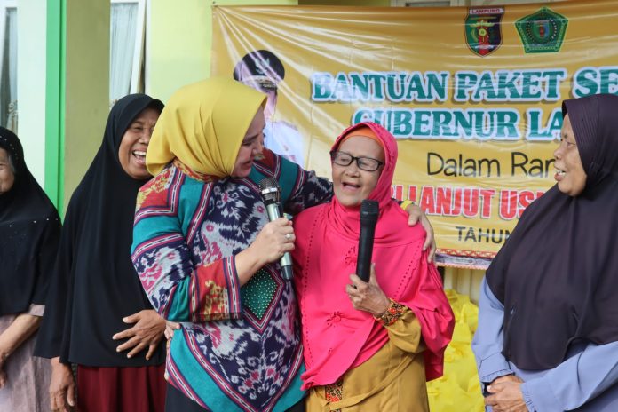 PRINGSEWU – Ketua Lembaga Koordinasi Kesejahteraan Sosial (LKKS) Provinsi Lampung Riana Sari Arinal menyerahkan bantuan Paket Sembako dalam rangka Hari Lanjut Usia Nasional ke-29 di Pekon Pringsewu Timur, Senin (19/06/2023).