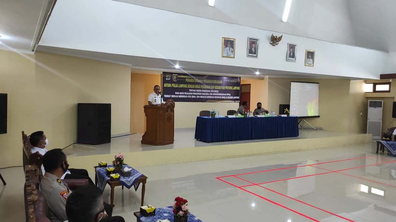 BANDARLAMPUNG(PeNa) – Direktur Lalu Lintas Polda Lampung, Kombes Pol. Donny Sabardi Halomoan Damanik, dengan Kepala Dinas Pendidikan dan Kebudayaan Provinsi Lampung, Drs. Sulpakar, menandatangani perjanjian kerjasama Insersi Pendidikan Lalu Lintas pada mata pelajaran Pendidikan Pancasila dan Kewarganegaraan (PPKn) tingkat Sekolah Menengah Atas (SMA) dan Sekolah Menengah Kejuruan (SMK), di Aula Dinas Pendidikan dan Kebudayaan Provinsi Lampung, Rabu (07/04/2021).