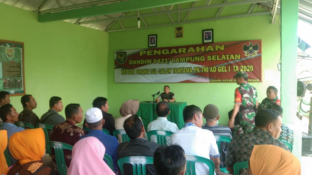 Demikian dikemukakan Dandim 0421/LS melalui Danramil 421-02/Gedong Tataan Kapten Inf Sugeng Pamuji saat memberikan pengarahan dan tatap muka dengan orang tua calon Tamtama PK di Aula Koramil 421-02/Gedong Tataan, Selasa (10/03/2020).
