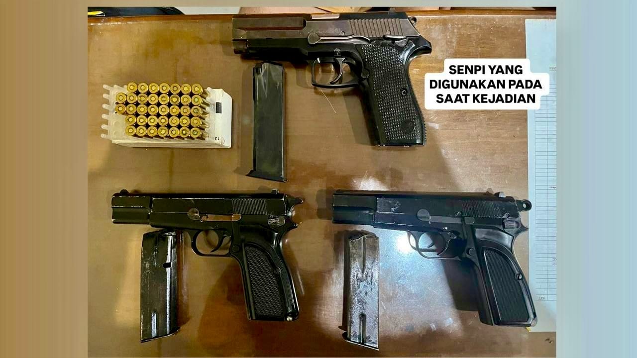 Dari lokasi, polisi menyita tiga pucuk senjata api beserta amunisi, satu unit Granmax, enam ponsel, serta sejumlah barang elektronik yang diduga terkait kejahatan.