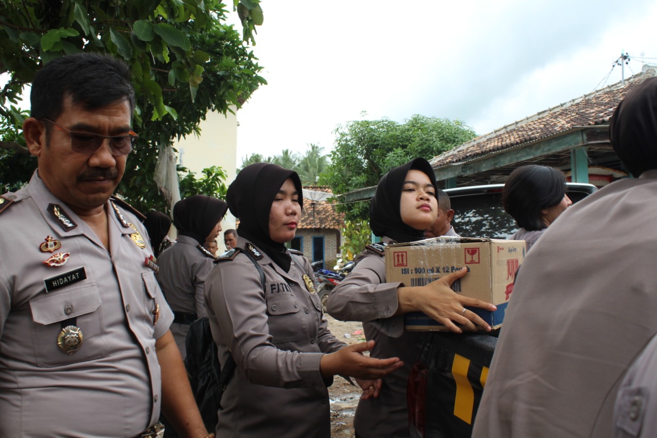 PESAWARAN-(PeNa), Polwan Jelema Ghamik Polres Pesawaran memberikan bantuan yang disasarkan kepada korban tsunami di Dusun Sinjai Desa Way Muli Lampung Selatan, Jumat (28/12) sekira pukul 10.00-17.00WIB.