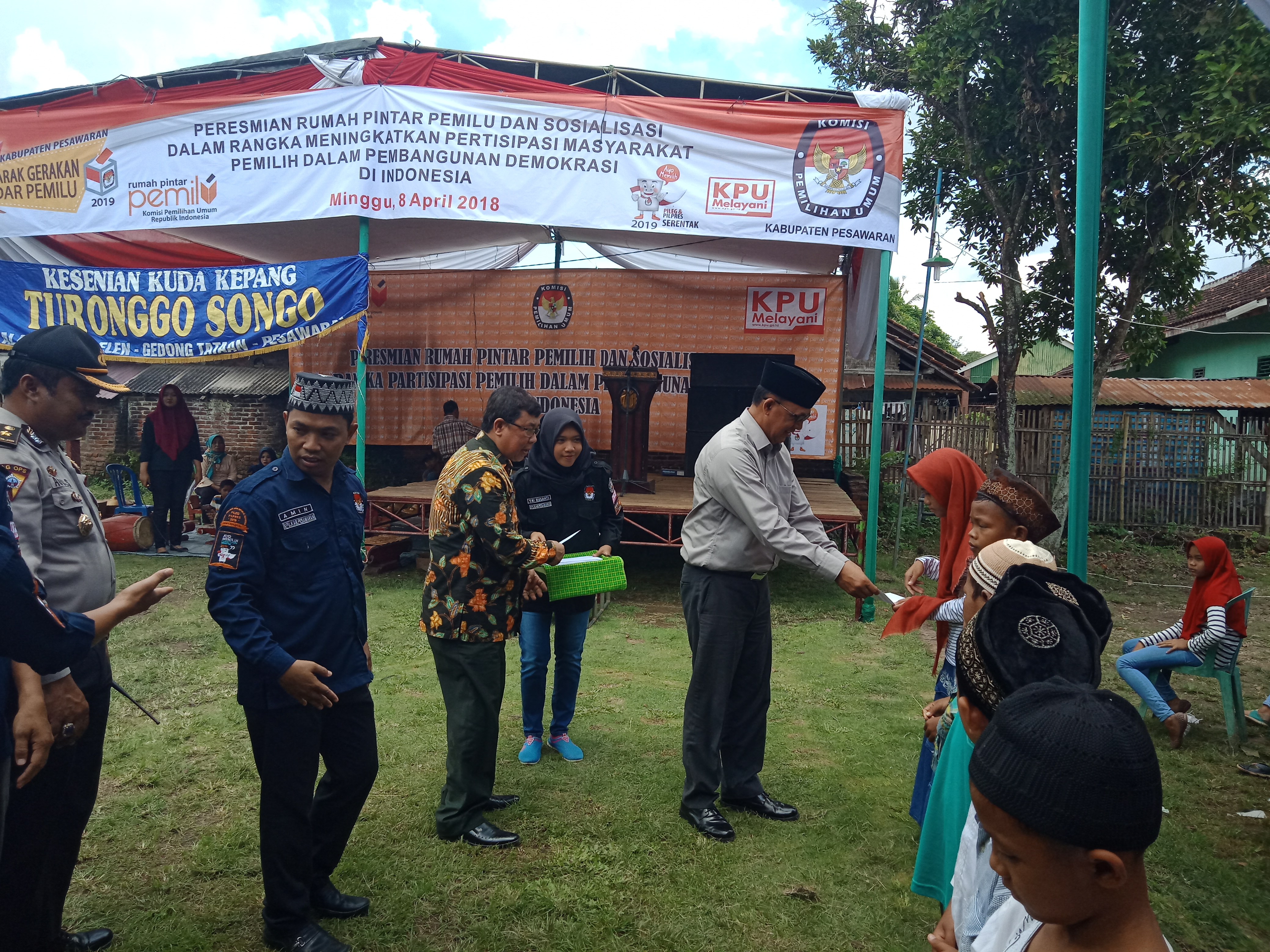 PESAWARAN-(PeNa), KPU Kabupaten Pesawaran memberikan santunan kepada anak yatim dan anak-anak duafa di halam kantornya, Desa Bagelen Kecamatan Gedong Tataan, Minggu (8/4).