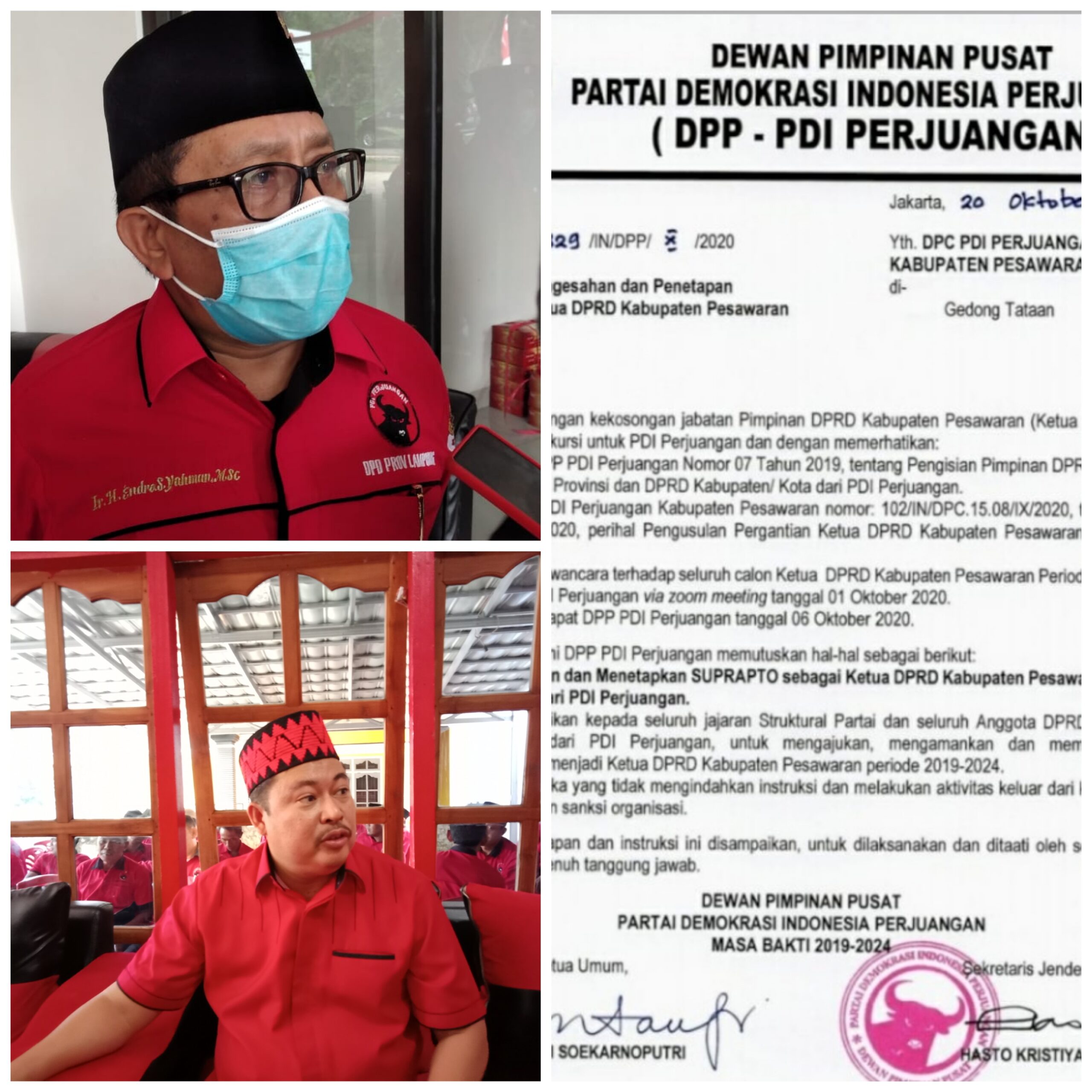 “Ya DPP sudah memutuskan, ini suratnya sudah ada ditangan saya yang asli. DPP menunjuk Sekretaris DPC PDIP Pesawaran, bapak Suprapto, sebagai ketua DPRD yang baru,” kata Ketua DPC PDIP Kabupaten Pesawaran Endro S Yahman, Rabu (21/10/2020).