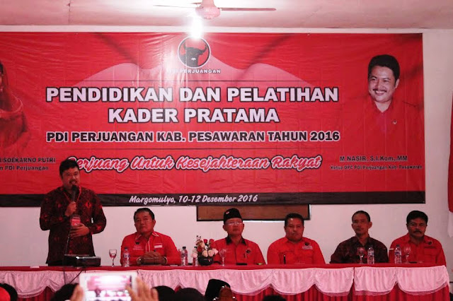 PESAWARAN (PeNa)-Untuk kali kedua, Partai Demokrasi Indonesia (PDI) Perjuangan menggelar pendidikan dan pelatihan kader tingkat pertama (pratama). Setelah DPC Pringsewu, kali ini giliran Pesawaran yang diikuti 110 kader dari seluruh Pengurus Anak Cabang (PAC). Kegiatan digelar dua hari sejak 10-11 Desember 2016 dipusatkan di Desa Margomulyo Pesawaran.