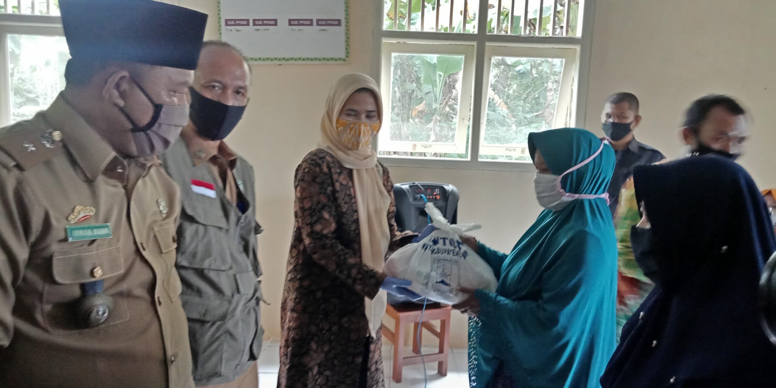 PESAWARAN-(PeNa), Ketua Dekranasda Kabupaten Pesawaran Nanda Indira Dendi serahkan bantuan paket sembako kepada pelaku usaha yang terdampak covid-19 di Kecamatan Way Khilau, Senin (06/07/2020).