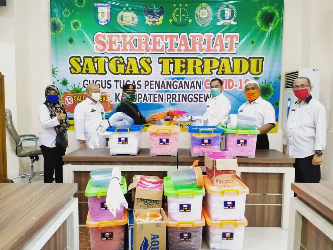 Bantuan berupa 100 paket Alat Pelindung Diri lengkap berupa baju hazmat dan cover penutup wajah dan diserahkan oleh Ketua Satgas NU PEDULI Kabupaten Pringsewu Marsudi dengan diterima oleh Sekretaris Daerah selaku Sekretaris Gugus Tugas Percepatan Penanganan Covid-19 Kabupaten Pringsewu A.Budiman PM di Posko Satgas Terpadu Gugus Tugas Percepatan Penanganan Covid-19 Kabupaten Pringsewu di Aula Utama Pemkab Pringsewu.