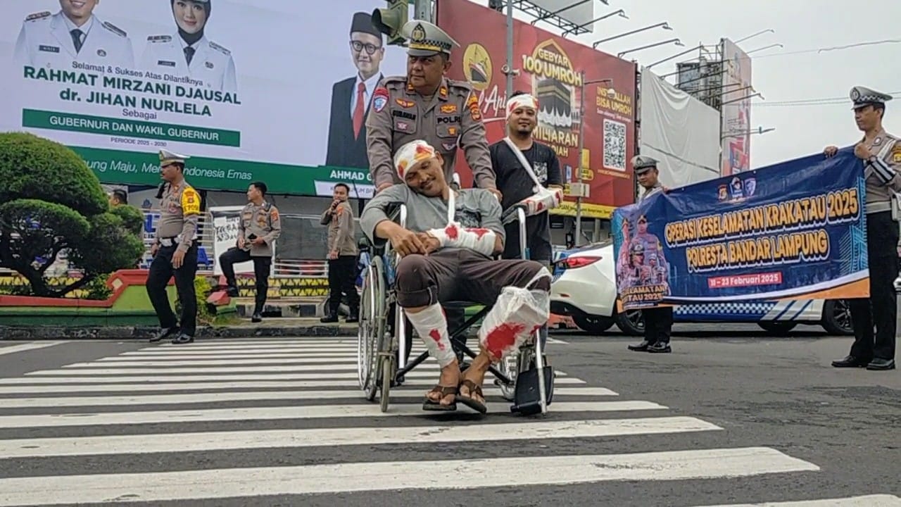 Bandar Lampung – (PeNa), Satlantas Polresta Bandar Lampung menggelar simulasi kecelakaan lalu lintas di Tugu Adipura dalam rangka Operasi Keselamatan Krakatau 2025, Jumat (21/2).