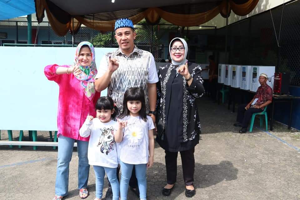 BANDARLAMPUNG-(PeNa), Mengawali aktifitas, Bupati Pesawaran Dendi Ramadhona beserta Istri dan keluarganya menunaikan hak suaranya di TPS 021 Jalan Bukit Kelurahan Kota Baru Kecamatan Tanjung Karang Timur Kota Bandarlampung, Rabu (17/04).