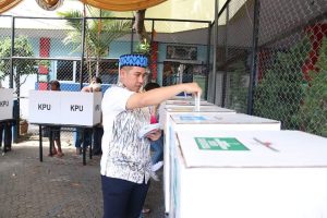 Usai memberikan hak pilihnya, kemudian memasukan kertas suara yang telah dicoblos kedalam kotak suara yang disiapkan oleh Panitia Pemungutan Suara.