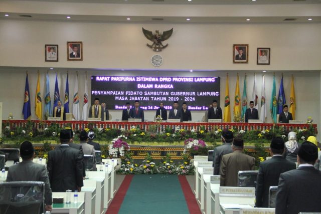 Sesaat sebelum dilakukan sidang paripurna, Dinas Pariwisata Lampung mempersembahkan penyambutan terhadap Gubernur Arinal Djunaidi dan Wakil Gubernur Chusnunia dengan tari penghormatan sigeuh pungeten dilanjutkan dengan persembahan lagu “Egham Ku di Lampung”. Terakhir dikumandangkan lagu kebangsaan Indonesia Raya.
