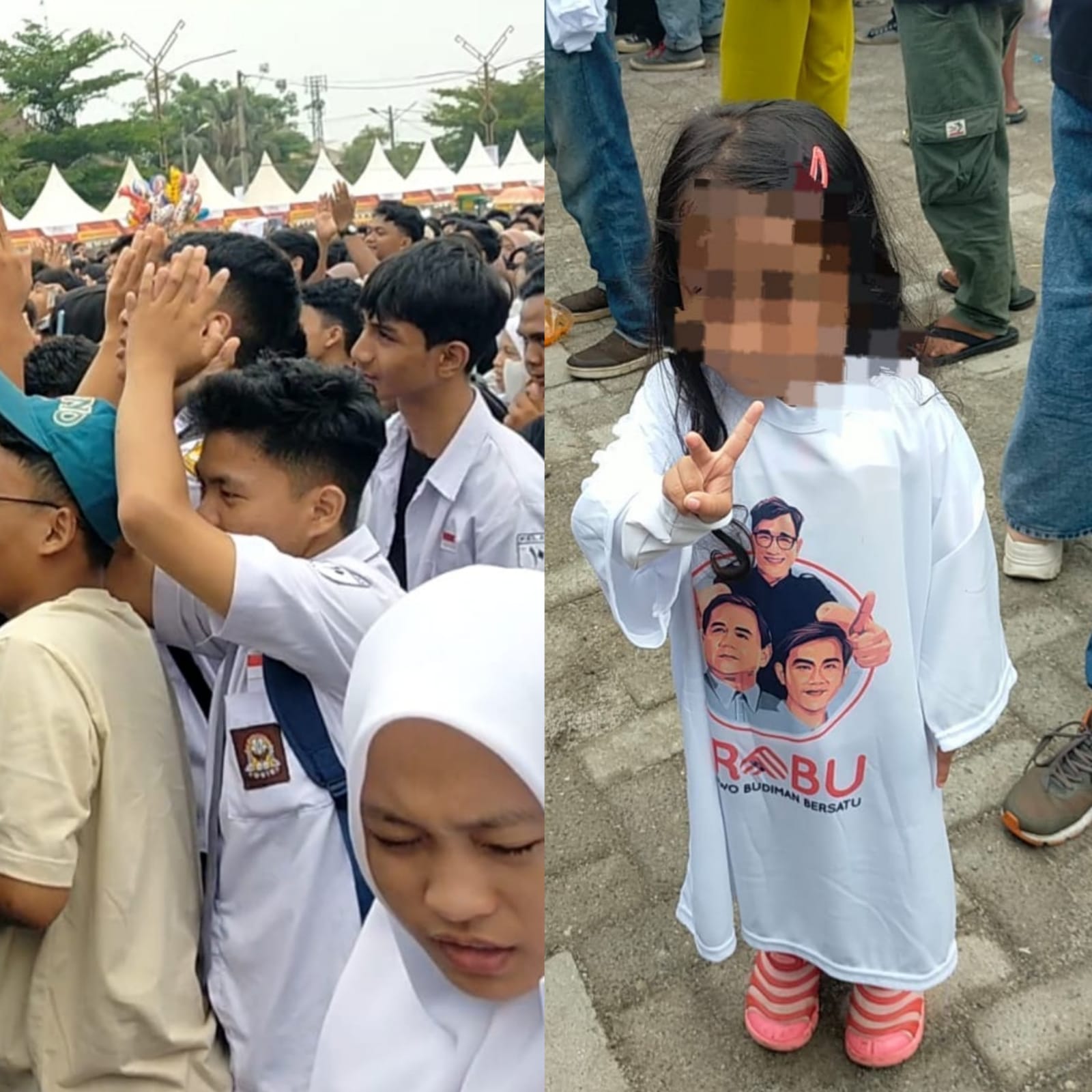 Tak Hanya itu, para orang tua membawa anak-anak tergolong masih usia balita dipakaikan kaus putih memampang wajah paslon Prabowo-Gibran berikut Budiman Sudjatmiko memberikan simbol jempol. “PRABU Prabowo Budiman Bersatu,” tulis kaus tersebut.