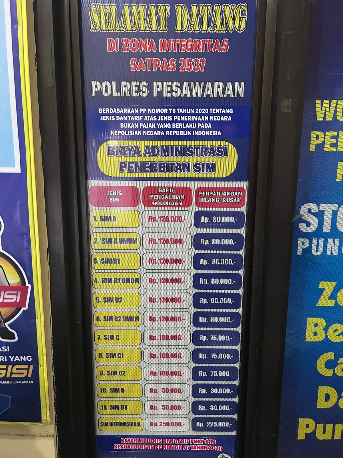 Aturan mengenai biaya pembuatan SIM terdapat di dalam Peraturan Pemerintah Republik Indonesia Nomor 76 Tahun 2020 tentang Jenis dan Tarif atas Jenis Penerimaan Negara Bukan Pajak yang Berlaku pada Kepolisian Negara Republik Indonesia.
