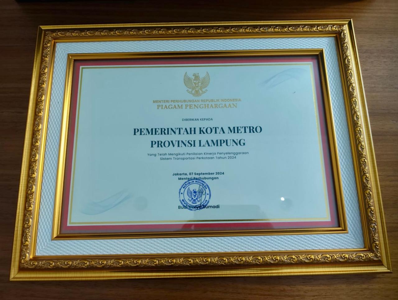 Sementara Pemerintah Kota Metro Provinsi Lampung, yang telah mengikuti penilaian Kinarja Penyelenggaraan Sistem Transportasi Perkotaan Tahun 2024 menerima Piala Wahana Tata Nugraha yang juga diberikan kepada 61 Pemerintah Kota/Kabupten dan Sertifikat Wahana Tata Nugraha kepada 100 Pemerintah Kota/Kabupaten.