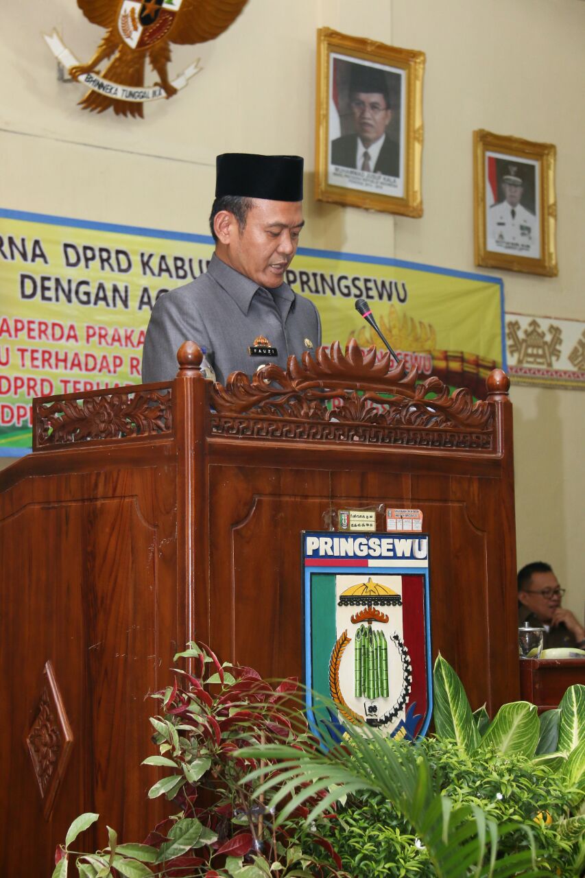 PRINGSEWU – Pemerintah Kabupaten Pringsewu mengusulkan agar pasal 55 tidak perlu dicantumkan dalam Rancangan Peraturan Daerah Tentang Kedudukan Protokoler, Hak Keuangan dan Administratif pimpinan dan anggota dewan Kabupaten Pringsewu.Wakil Bupati Pringsewu, Fauzi dalam sambutannya pada rapat paripurna tentang Pendapat Bupati Pringsewu terhadap Ranperda prakarsa DPRD Pringsewu yang dipimpin Ketua DPRD Ilyasa di gedung DPRD setempat, Senin (17/7) menyebutkan bahwa