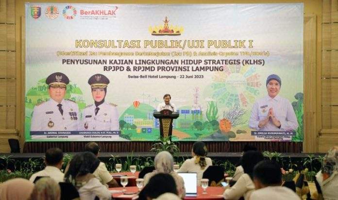BANDARLAMPUNG – Pemerintah Provinsi Lampung menyelenggarakan Konsultasi Publik/Uji Publik I Penyusunan Kajian Lingkungan Hidup Strategis (KLHS) RPJPD dan RPJMD Provinsi Lampung yang mengacu pada Visi Indonesia 2045, di Ballroom Swiss-Belhotel Bandar Lampung, Kamis (22/6/2023).