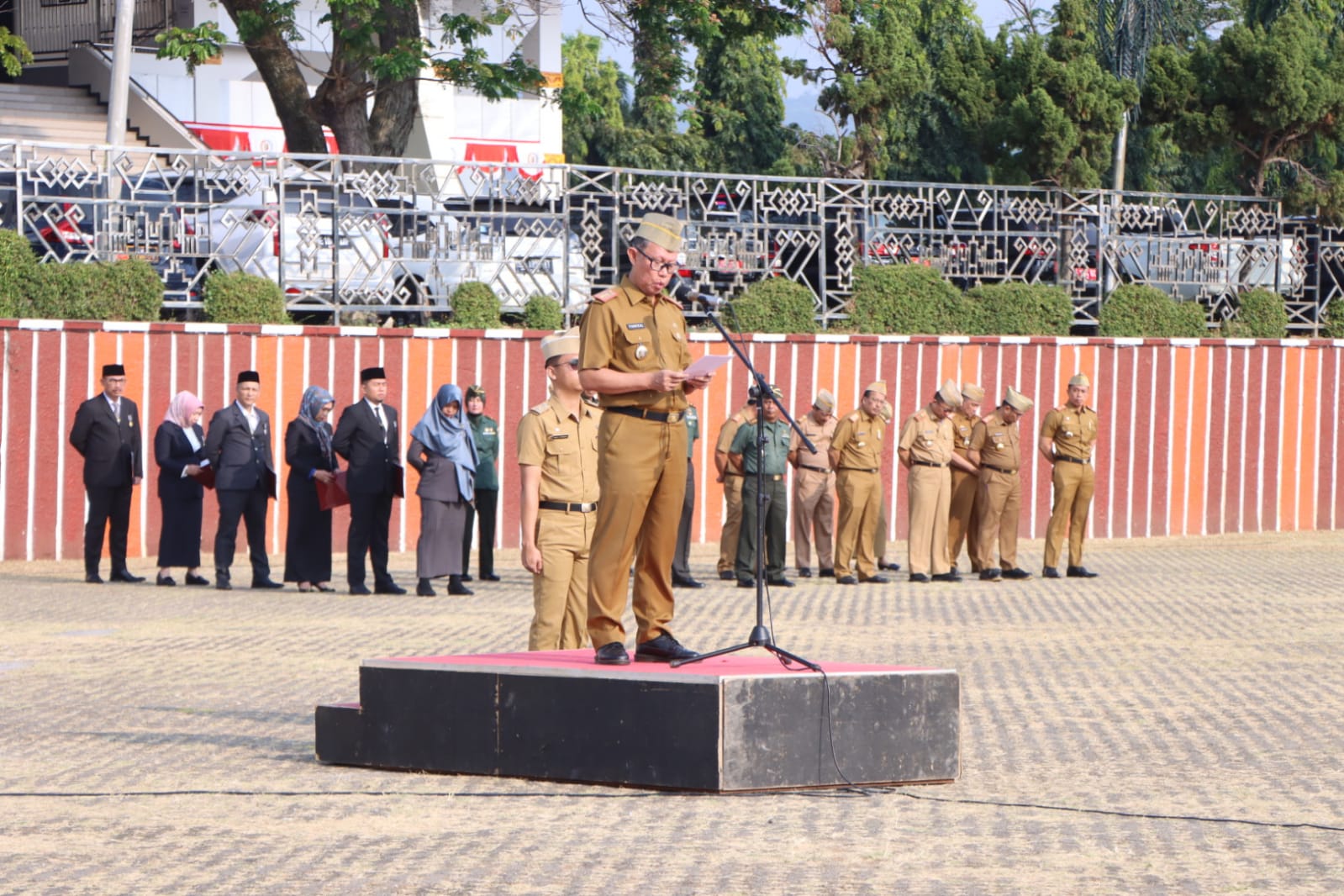 BANDARLAMPUNG – Sekretaris Daerah Provinsi Lampung, Fahrizal Darminto menjadi Inspektur upacara pada Upacara Bulanan bersama Forkopimda Provinsi Lampung, di Lapangan Korpri Komplek Kantor Gubernur Lampung, Senin (04/09/2023).