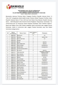 Berdasarkan ketentuan Peraturan Badan Pengawas Pemilihan Republik Indonesia Nomor 19. Tahun 2017 sebagaimana diubah terakhir dengan Peraturan Badan Pengawas Pemilihan Umum. Republik Indonesia Nomor 8 Tahun 2019 dan Surat Edaran Ketua Bawaslu Republik Indonesia Nomor : 0547/K.Bawaslu/TU.00.01/XII/2019 Perihal Penjelasan Pengumuman Administrasi, Tes