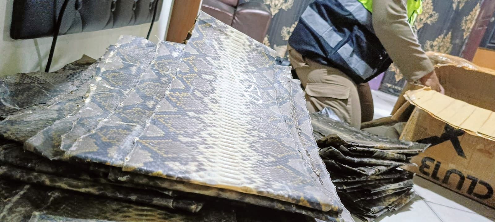 Barang bukti berupa 88 lembar kulit ular dan 374 lembar kulit biawak ditemukan dikemas dalam paket jasa ekspedisi.