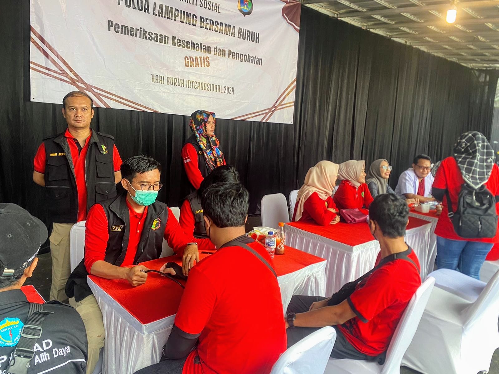 BANDARLAMPUNG (PeNa) – Kepolisian Daerah Lampung menggelar pelayanan kesehatan dan pasar murah dalam rangka memperingati Hari Buruh Internasional di Bundaran Tugu Adipura, Bandar Lampung.