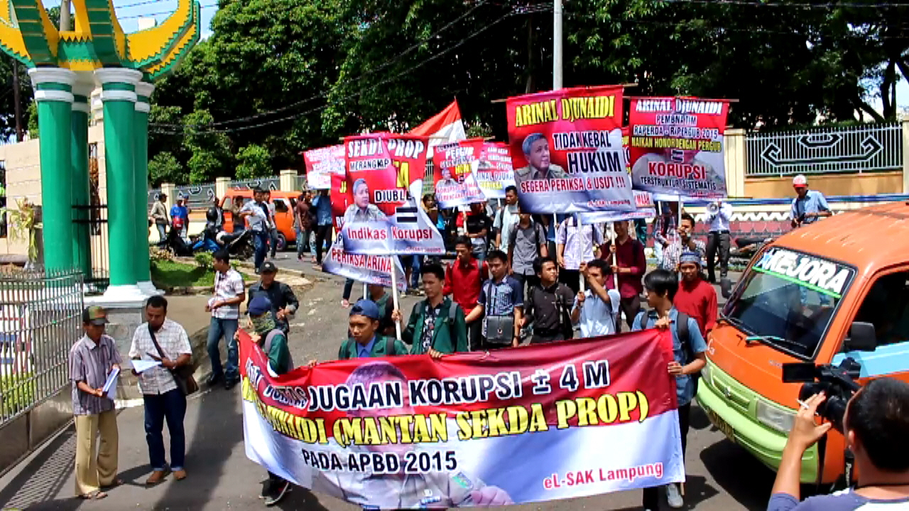 Ratusan massa yang menamakan diri Lingkar Study Advokasi Kebijakan (eL-SAK) berorasi di pintu gerbang kejaksaan. Dalam orasinya, massa menuntut pihak Kejati Lampung untuk segera mengusut tuntas dugaan korupsi sebesar Rp4 miliar yang di lakukan Mantan Sekretaris Daerah Provinsi Lampung Arinal Djunaidi.
