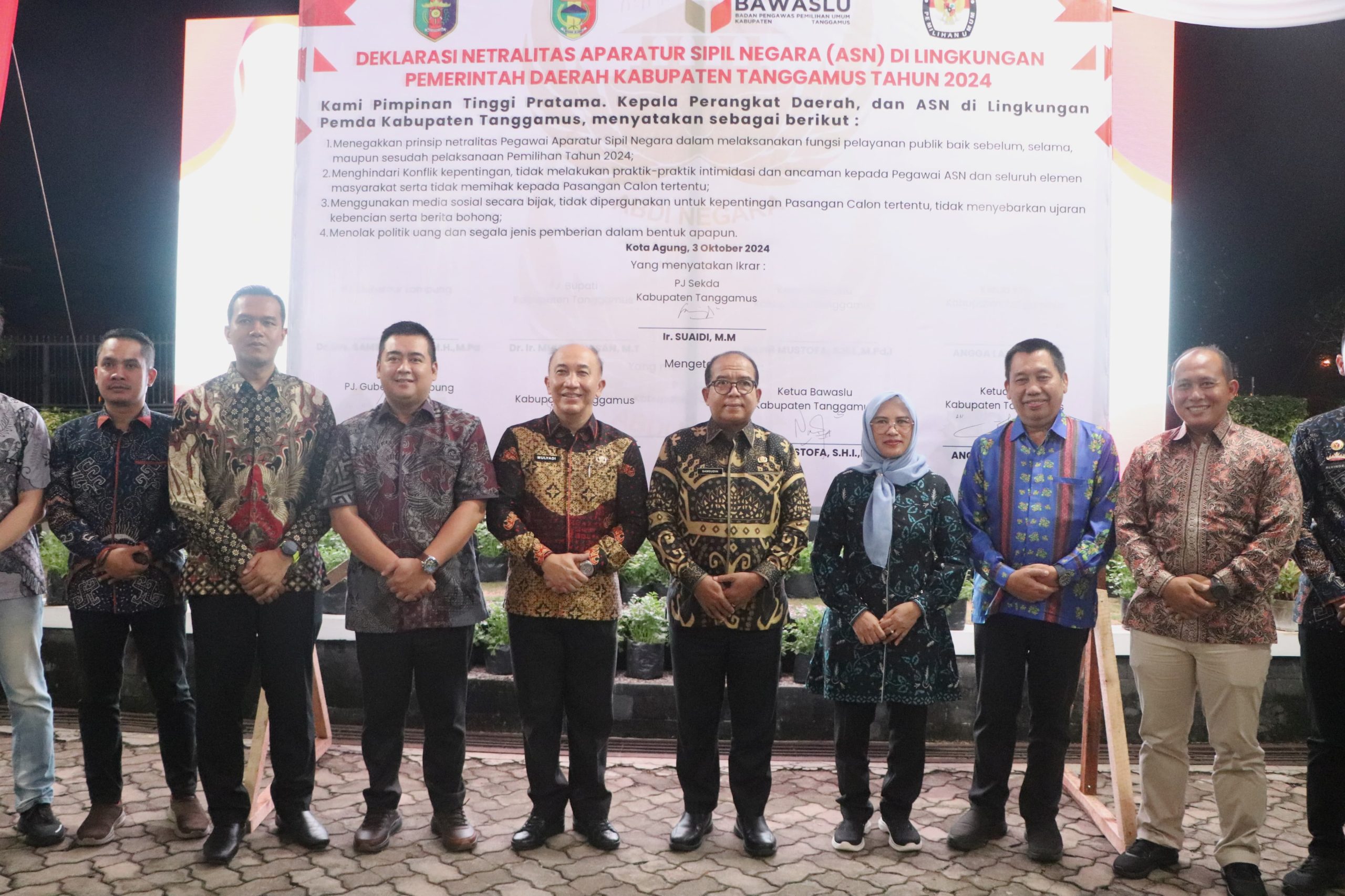 Pada kegiatan tersebut juga dilakukan pembacaan dan penandatanganan Deklarasi Netralitas Aparatur Sipil Negara (ASN) di Lingkungan Pemerintah Daerah Kabupaten Tanggamus tahun 2024 oleh Pj. Sekretaris Daerah Kabupaten Tanggamus Suaidi, dan turut diketahui dan ditandatangani oleh Pj. Gubernur Lampung Samsudin, Pj. Bupati Tanggamus Mulyadi Irsan, Ketua Bawaslu Tanggamus Najih Mustofa dan Ketua KPU Tanggamus Angga Lazuardy.