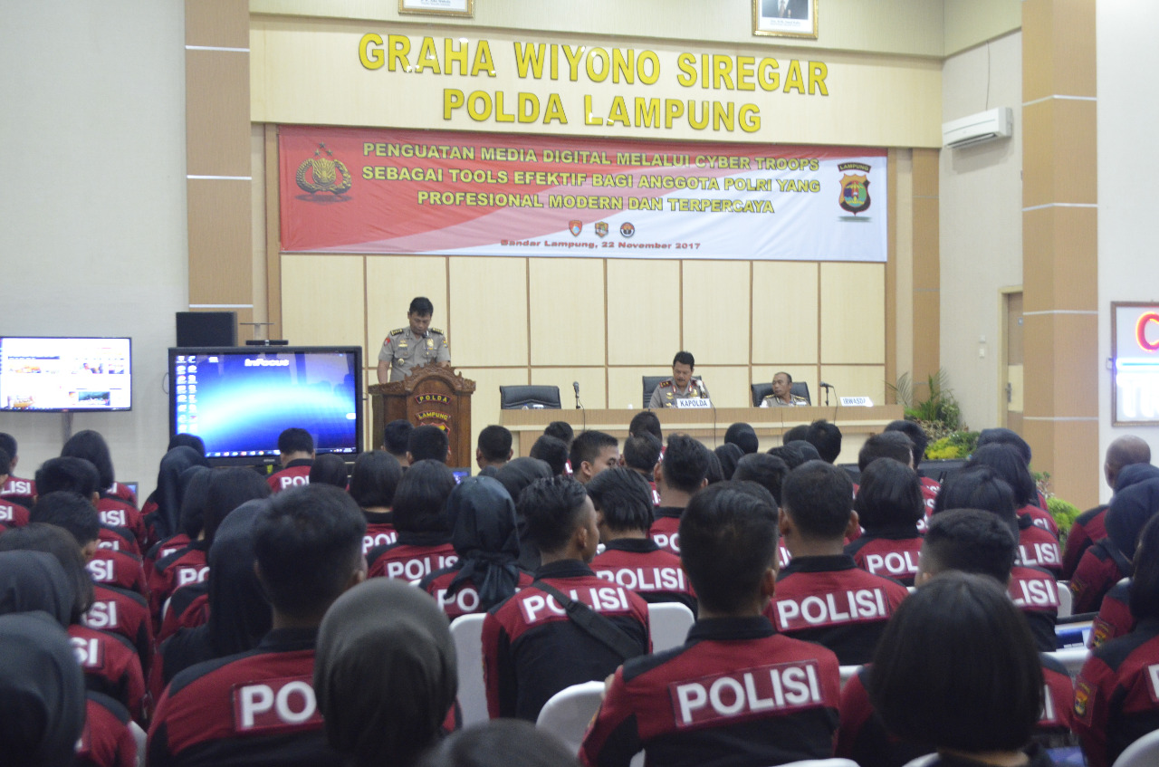 BANDARLAMPUNG-(PeNa), Kepolisian Daerah (Polda) Lampung mengukukuhkan pasukan khusus dunia maya (Cyber Troops) guna memberikan pelayanan masyarakat di Graha Wiyono Siregar, Rabu (22/11).