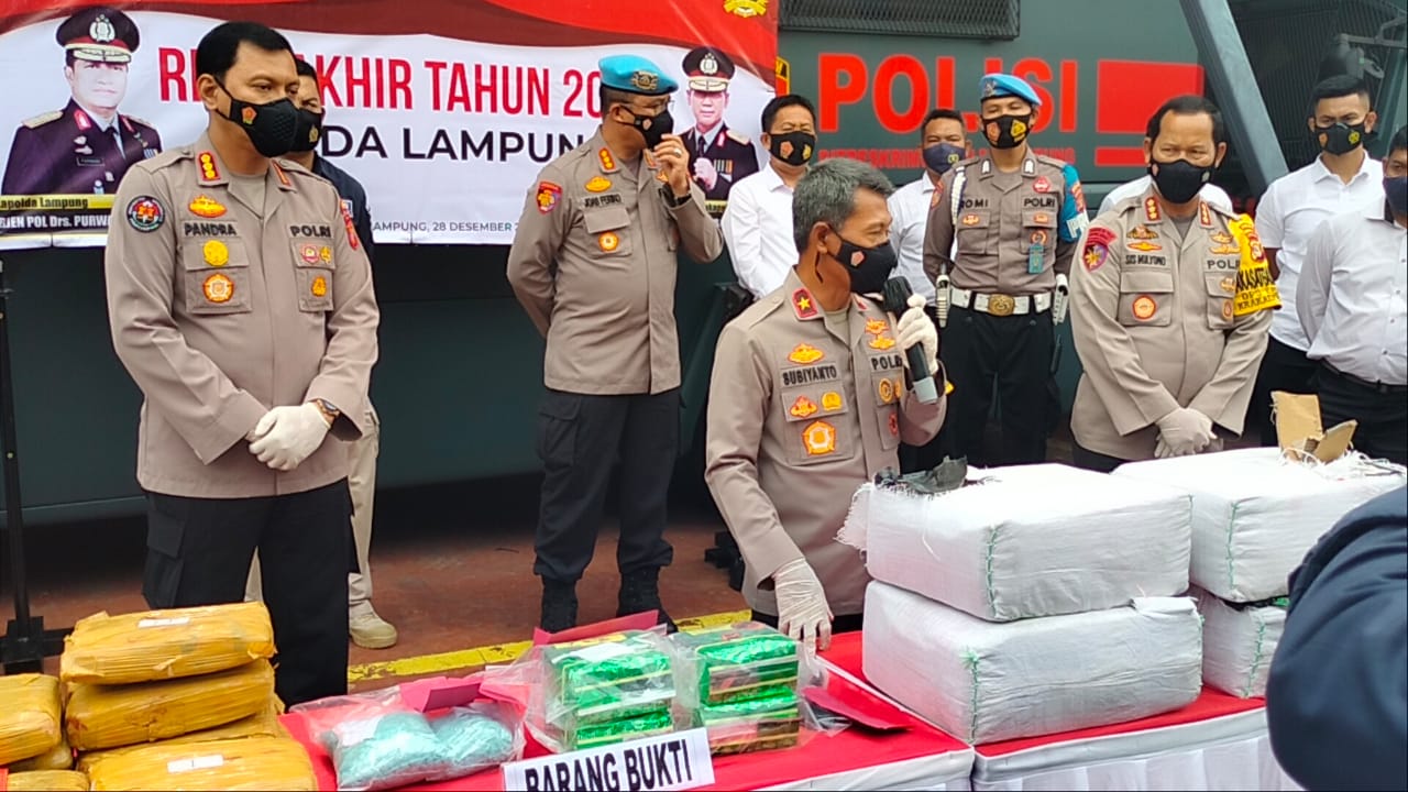 “Ratusan kilogram sabu-sabu dan puluhan ribu butir pil ekstacy yang berhasil digagalkan, diduga akan diedarkan oleh para tersangka, pada Tahun Baru 2021,”kata Subiyanto, saat ekspose, di Markas Polda Lampung.