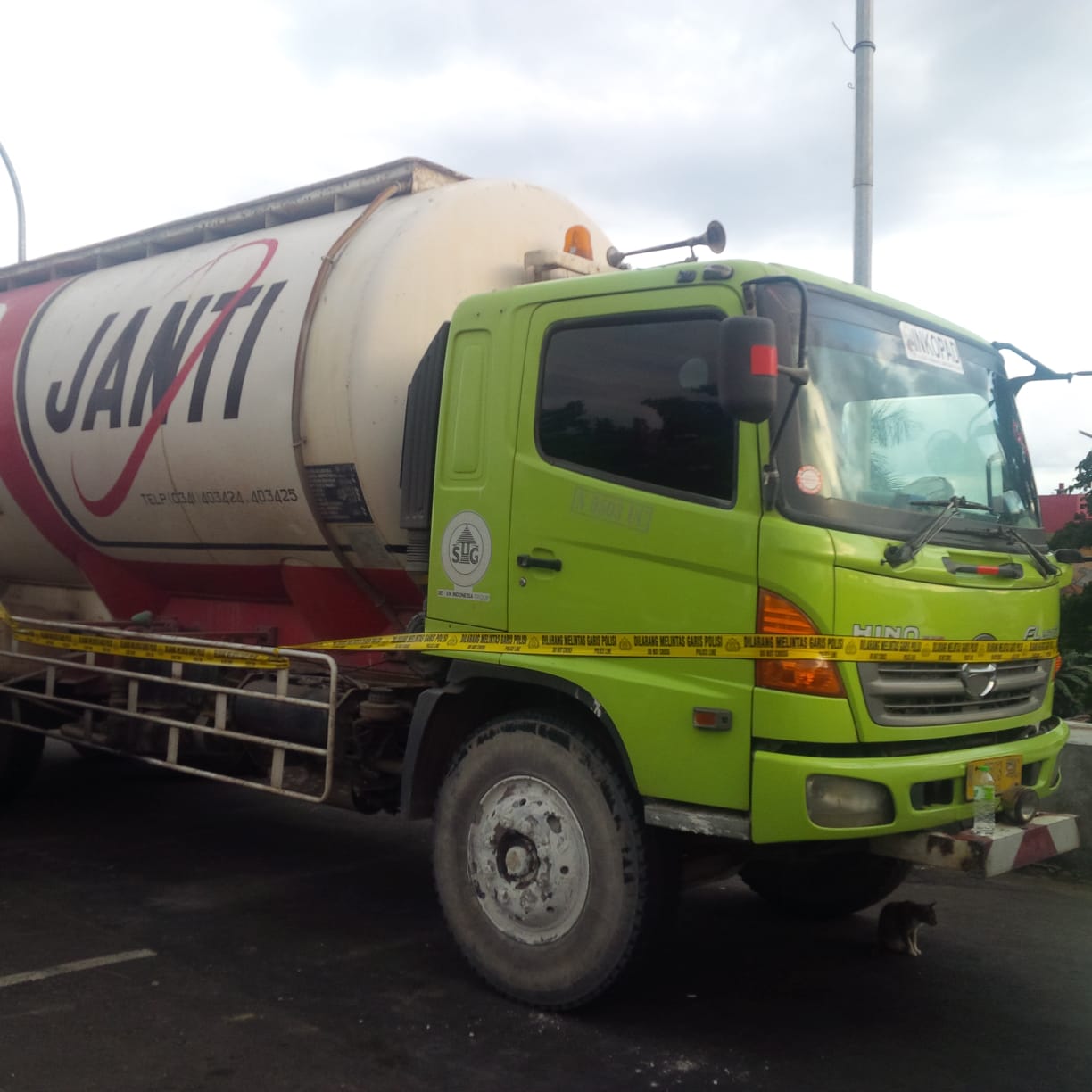 Dari informasi yang di himpun Pelitanusantara.co.id di lokasi, mobil truk berwarna hijau dengan tanki berwarna putih bertuliskan JANTI, di duga milik PT JANTI merupakan distributor sekaligus transporter material semen. PeNa-obin.