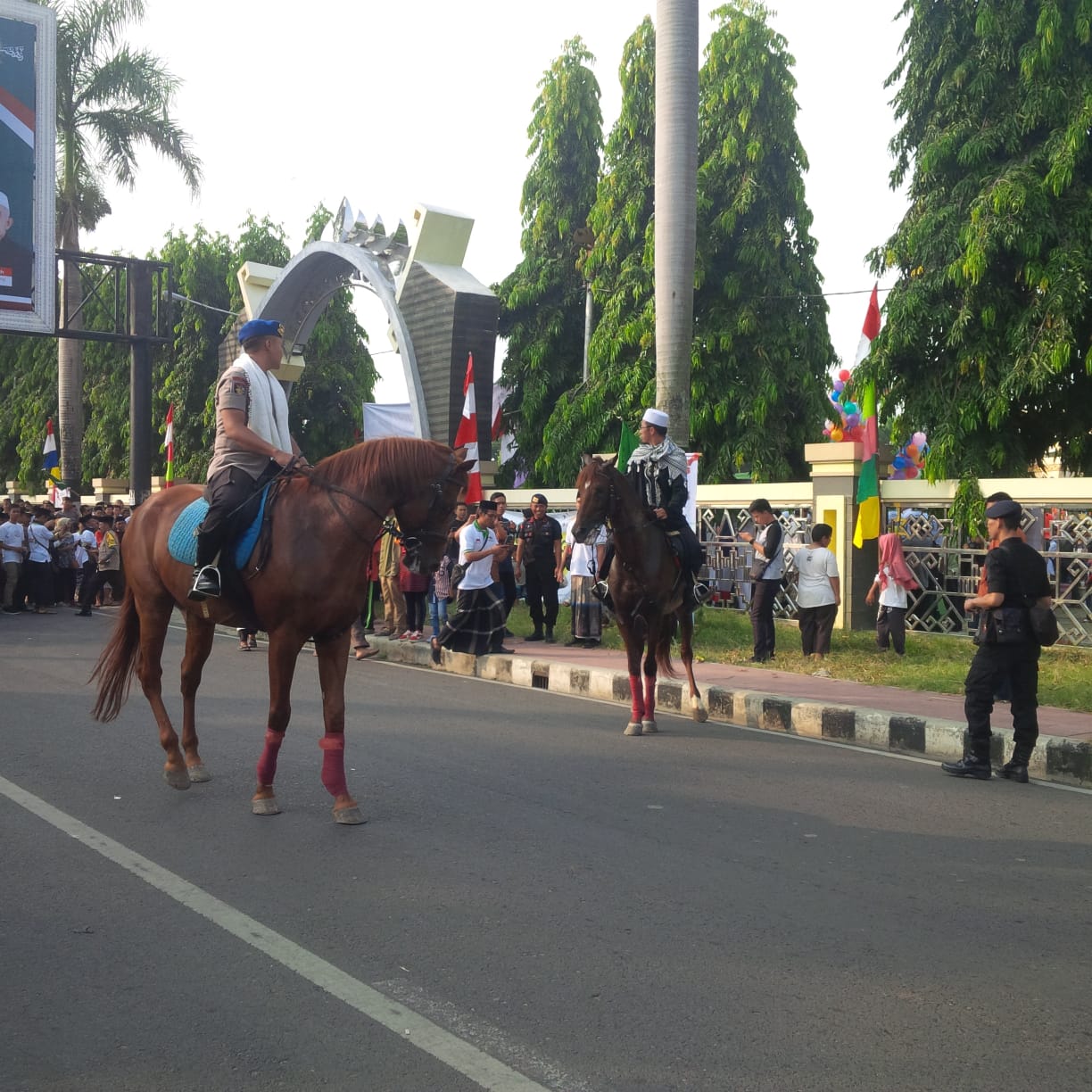 BANDARLAMPUNG-(PeNa), Polda Lampung datangkan dua kuda bernama Bintang dan Thunder dari tempat Wisata Berkuda Riverside Ranch Natar Lampung Selatan, untuk ikut berpartisipasi dan mendukung peringatan Hari Santri Nasional, di Lapangan Korpri Provinsi Lampung, di Jalan Wortel Mongosidi, Telukbetung Selatan, Bandarlampung, Minggu (21/10) pagi.