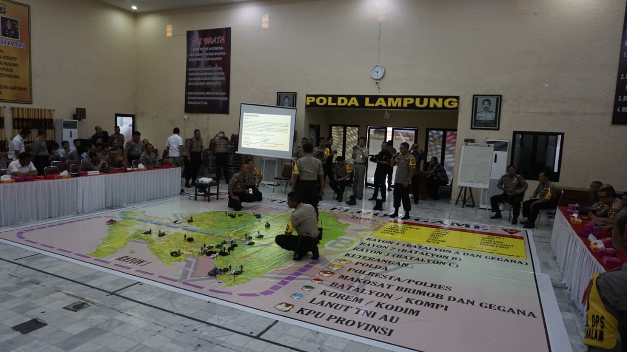 BANDARLAMPUNG (PeNa) – Menghadapi kontijensi gangguan Keamanan Ketertiban Masyarakat (Kamtibmas) dan bencana alam dalam penyelenggaraan Pemilu 2019, Polda Lampung gunakan strategi Tactical Floor Game dan Tactical Wall Game, Kamis (21/03).