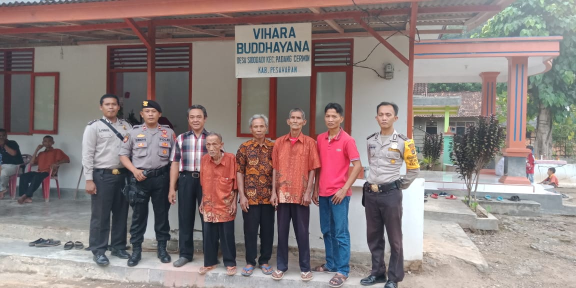 PESAWARAN-(PeNa), Jajaran kepolisian dari Polsek Padang Cermin amankan jalannya peribadatan di Wihara Budhayana di Dusun III Desa Sidodadi Kecamatan Teluk Pandan, Sabtu (18/05).