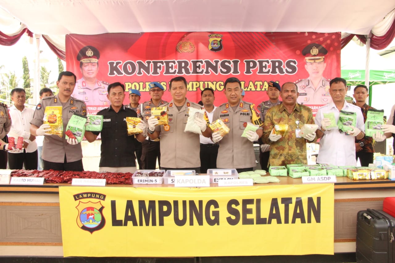 Kapolda Lampung, Irjen Pol. Purwadi Arianto, didampingi Direktur Reserse Narkoba Polda Lampung, Kombes Pol. Shobarmen, Kabid Humas Polda Lampung, AKBP. Zahwani Pandra Arsyad, dan Kapolres lampung Selatan, AKBP. M Syarhan mengatakan, barang bukti narkoba jenis sabu-sabu, pil ekstacy dan pil erimin 5 yang diamankan merupakan hasil ungkap kasus sejak Maret 2019 lalu.