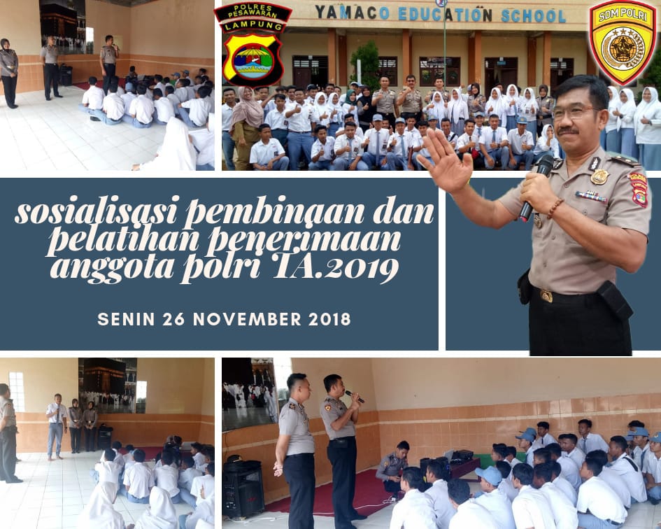 Hal tersebut diungkapkan ketika sosialisasi penerimaan anggota Polri tahun 2019 dilima sekolah yang berada diwilayah hukum Polres Pesawaran, Senin (26/11). Kelima sekolah tersebut adalah SMA Negeri 2 Gedong Tataan, SMA Negeri 1 Gedong Tataan, SMK Pelita, SMK Yamako dan SMK Negeri 1 Negeri Katon Kabupaten Pesawaran.