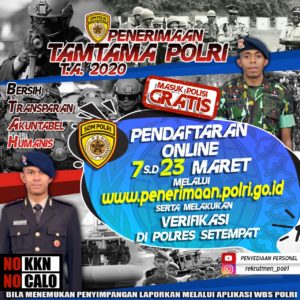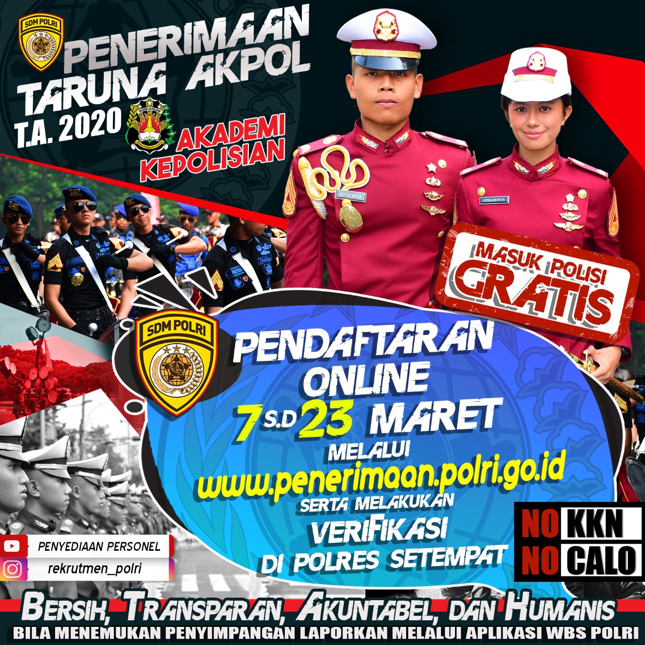 Penerimaan ketiga program kepolisian tersebut dimulai dari 07 sampai 23 Maret 2020 melalui situs www.penerimaan.polri.go.id di Polres terdekat dengan lokasi tinggal Anda saat ini.