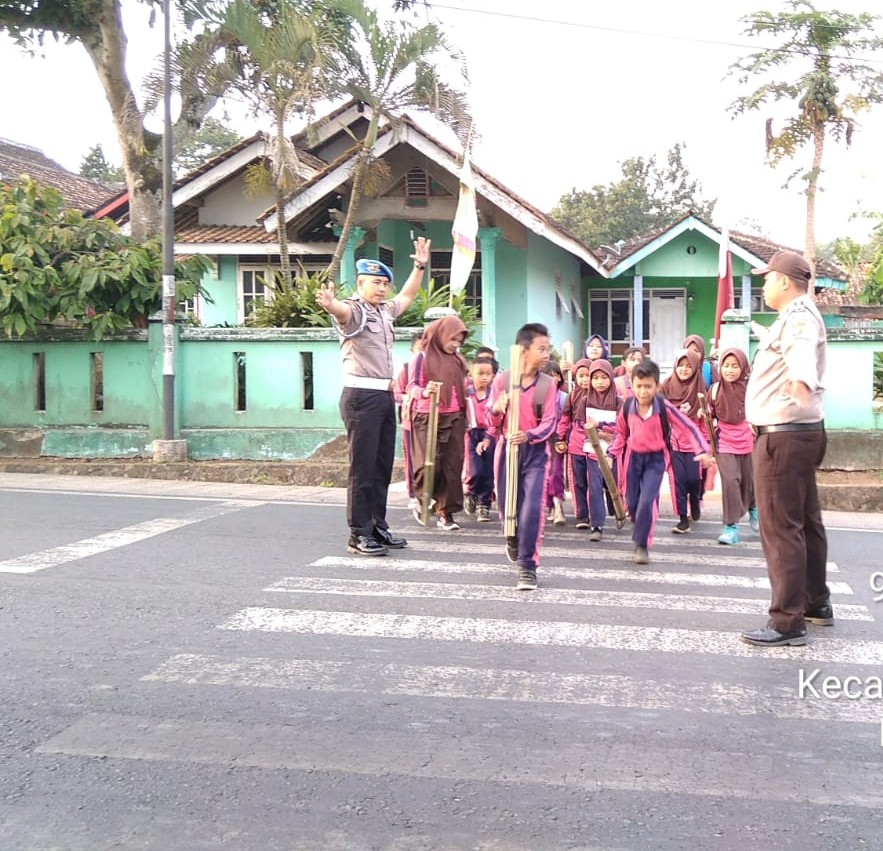 PESAWARAN-(PeNa), Personil provos dan Polsek Gedung Tataan turun ke jalan raya membantu siswa dan siswi serta warga yang akan menyeberang atau melintas di depan SDN 38 Kebagusan, Jumat (09/08/2019).