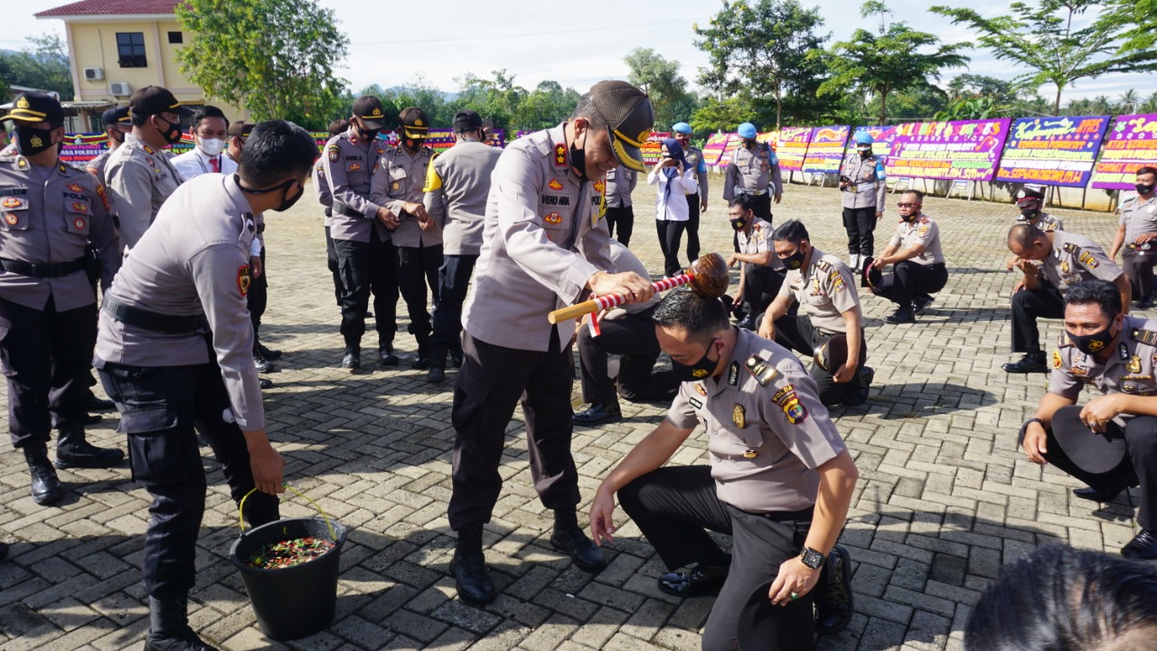 PESAWARAN-(PeNa), Kapolres Pesawaran AKBP Vero Aria Radmantyo menyiramkan air kembang kepada anggota yang menerima kenaikan pangkat di Halaman Mapolres setempat, Senin (04/01/2021).