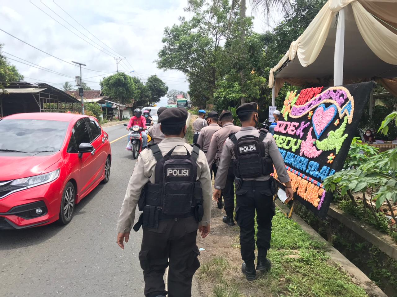 PESAWARAN-(PeNa), Sedikitnya 20 personil Sat Sabhara Polres Pesawaran mendatangi Acara Resepsi Pesta Pernikahan ditengah pandemi Corona di Jalan Ahmad Yani Desa Bernung Kecamatan Gedong Tataan, Sabtu (20/02/2021).