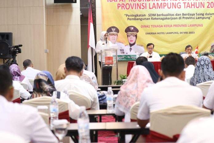 BANDARLAMPUNG – Pemerintah Provinsi Lampung menggelar kegiatan rapat koordinasi dan konsolidasi arah kebijakan ketenagakerjaan Provinsi Lampung Tahun 2024, di Hotel Emersia, Kamis (04/05/2023).