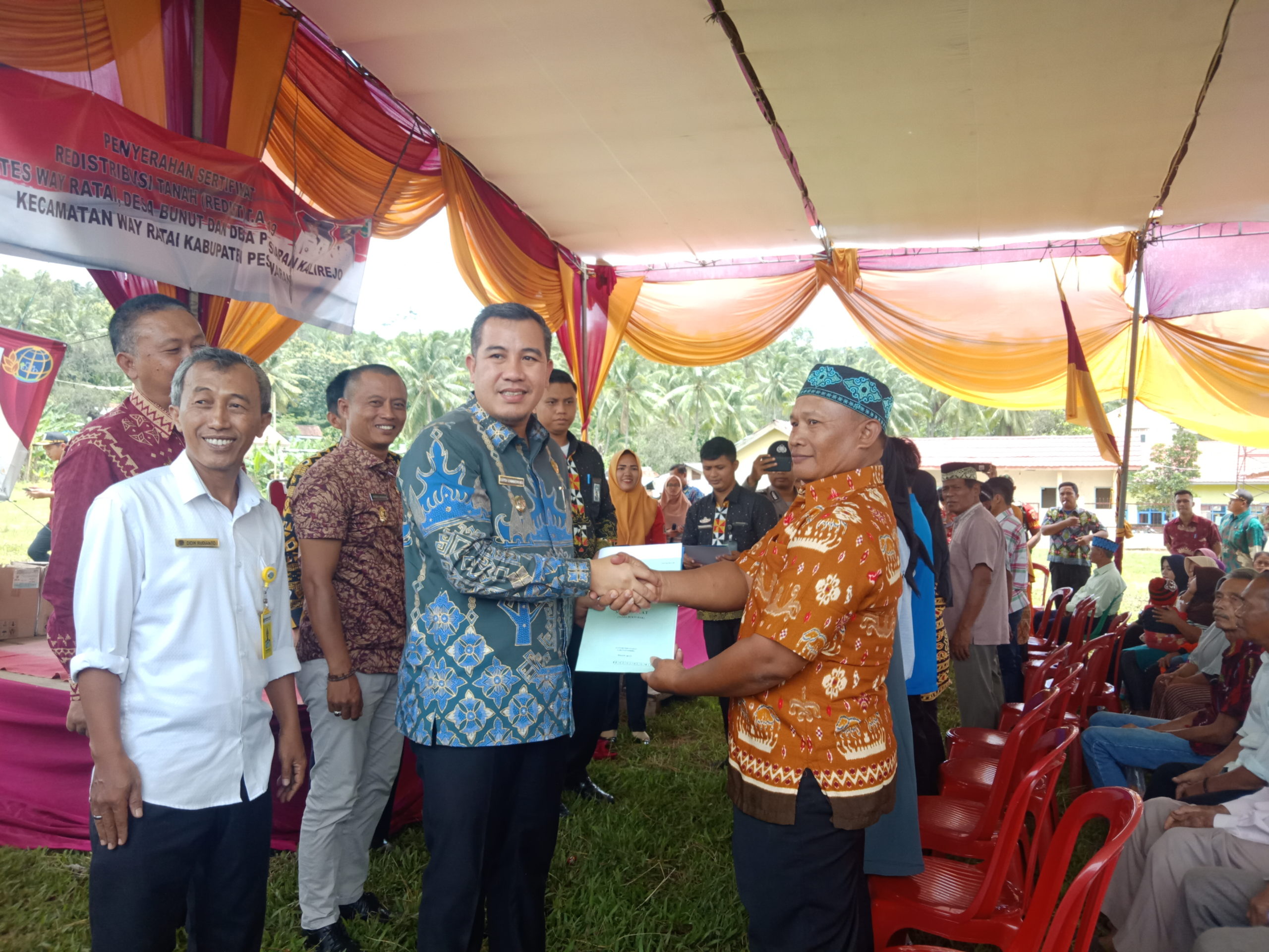Penyerahan sertifikat redistribusi tanah (Redist) Tahun Anggaran 2019 Desa Wates Way Ratai, Desa Bunut, Desa Persiapan Kalirejo Kecamatan Way Ratai tersebut dilakukan Bupati Pesawaran Dendi Ramadhona di Lapangan Desa Wates Way Ratai, Kamis (20/02/2020).
