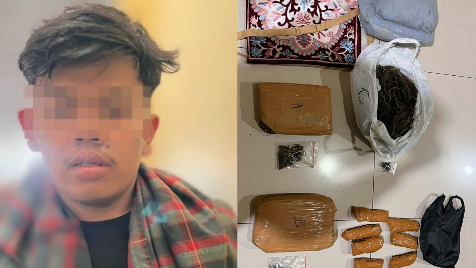 Saat Ditangkap, petugas menemukan 2 paket besar berisi daun kering ganja, 1 buah kantong plastik putih berisi ganja, dan 7 paket ukuran sedang daun ganja kering di dalam tas ransel di kamar kost pelaku ET (18).