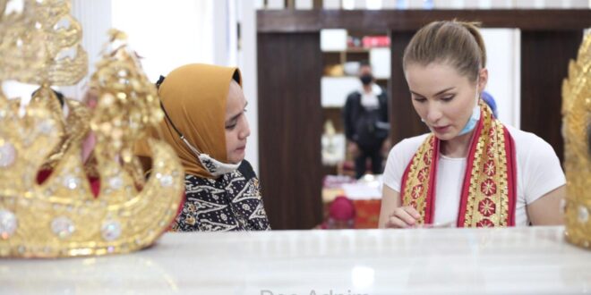 BANDARLAMPUNG (PeNa) – Ketua Dewan Kerajinan Nasional Indonesia Daerah (Dekranasda) Lampung Ibu Riana Sari Arinal menerima kunjungan Tim Publikasi Inovasi Daerah Balitbang Kemendagri di Dekranasda Lampung, Senin petang (13/7/2020). Tim yang terdiri dari Mbak Tina Bule, dan Wahyu (Youtuber) diterima Ibu Riana yang dengan bangga memperkenalkan sejumlah karya kerajinan Lampung. Salah satunya kain tapis.
