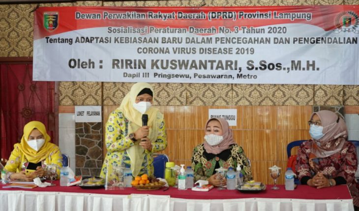 PRINGSEWU (PeNa) – Wakil Ketua DPRD Provinsi Lampung Hj. Ririn Kuswantari, S.Sos, MH, melakukan sosialisasi perda (Sosper) Provinsi Lampung Nomor 3 Tahun 2020 tentang Adaptasi Kebiasaan Baru dalam Pencegahan dan Pengendalian Corona Virus Disease (Covid-19).