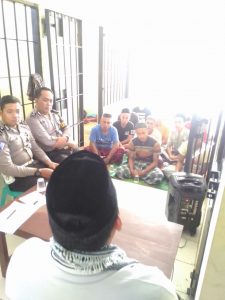 PESAWARAN-(PeNa), Untuk memberikan semangat dan penyadaran kepada 34 tahanan, Ustad Nuruddin memberikan tausyiah guna menyiram rohaninya di Mapolres Pesawaran, Jumat (26/1).