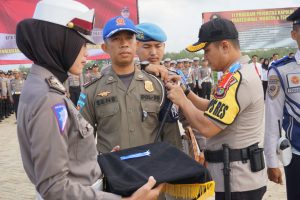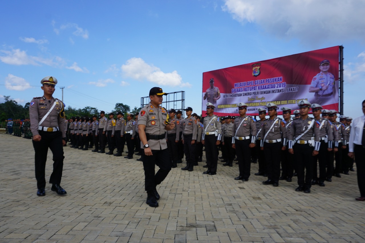 PESAWARAN-(PeNa), Kapolres Pesawaran AKBP Popon Ardianto Sunggoro membacakan amanat Kapolri pada Apel gelar pasukan Ops Ketupat Krakatau 2019 di Halaman Mapolres setempat, Selasa (28/05).