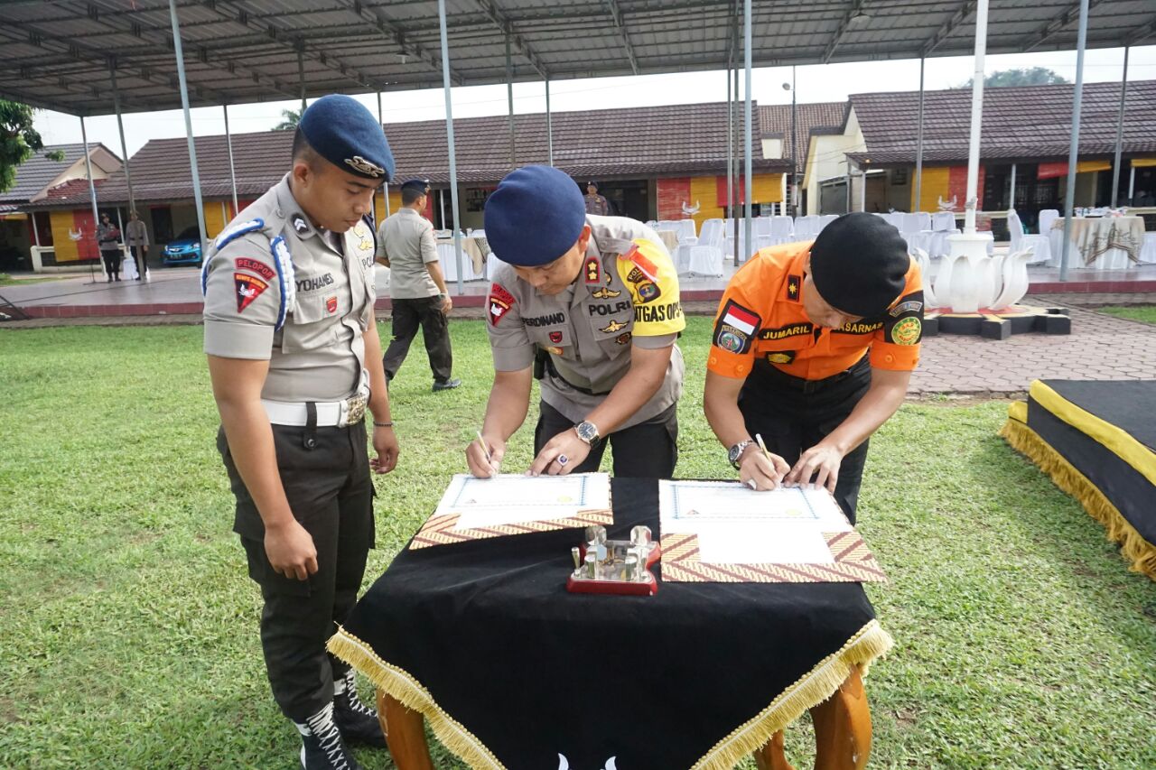 BANDARLAMPUNG (PeNa)- Sat Brimob Polda Lampung dan anggota Kantor Pencarian dan Pertolongan Kelas A Lampung (Basarnas) sepakati dengan menandatangani Memory of Understanding (MoU) penanggulangan bencana, di Mako Satbrimob Polda Lampung, Rabu (16/5).