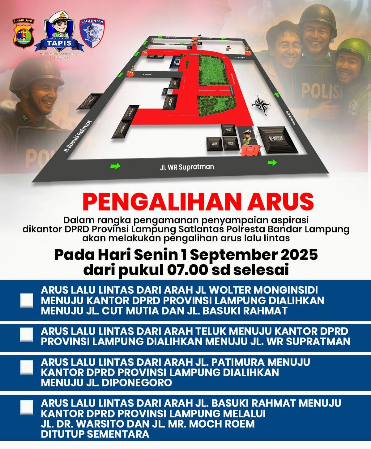 LAMPUNG – (PeNa), Satuan Lalu Lintas Polresta Bandar Lampung akan melakukan rekayasa arus kendaraan pada Senin (1/9/2025) mulai pukul 07.00 WIB hingga selesai, demi mendukung keamanan.