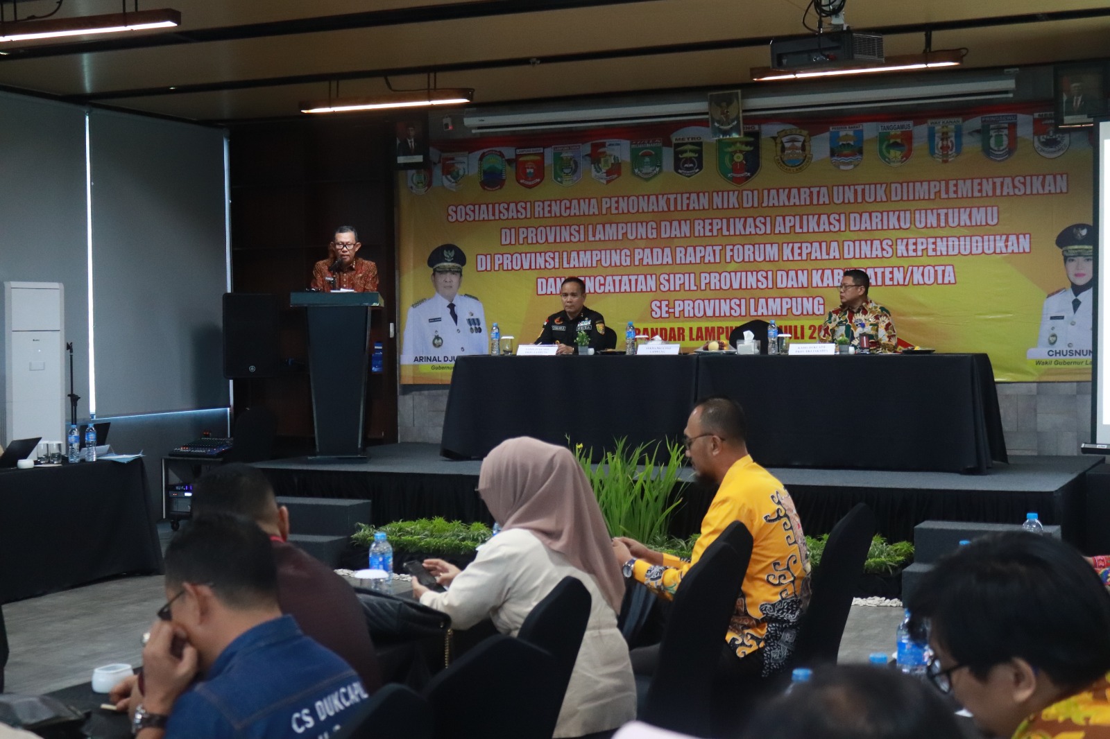 BANDARLAMPUNG – Gubernur Lampung diwakili oleh Sekretaris Daerah Provinsi Lampung, Fahrizal Darminto membuka acara Sosialisasi Rencana Penonaktifan Nomor Induk Kependudukan (NIK) di Jakarta untuk Diimplementasikan di Provinsi Lampung, bertempat di Hotel Kyriad, Jumat (21/07/2023).