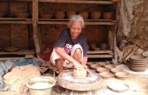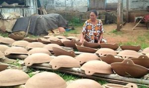 Sementara disisi lain, yakni Boinem (52) yang juga sudah puluhan tahun menekuni usaha membuat perabotan gerabah rumah tangga dari tanah liat hingga saat ini. Meski sudah tidak muda lagi, tangan Boinem masih begitu cekatan, cepat dan terlatih memainkan jemari tangannya membentuk piringan dari tanah liat (penggorengan kopi) diatas alat sederhana yang terbuat dari papan kayu berbentuk bulat yang ada didepannya.