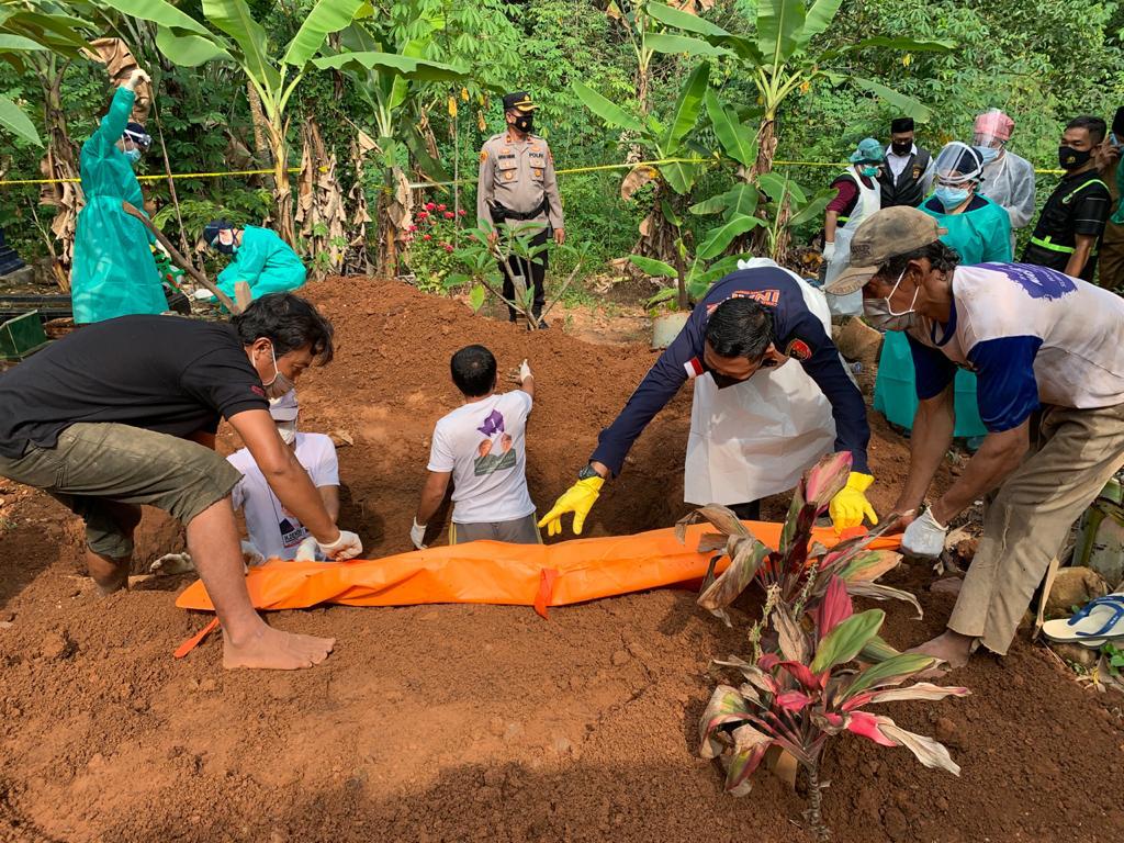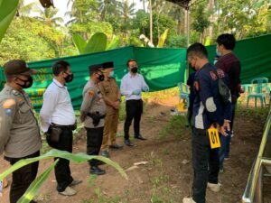 P E S A W A R A N – (PeNa), Karena rasa penasaran, jenazah Herli Hasan (66) warga Dusun Kejadian Desa Kurungan Nyawa Kecamatan Gedong Tataan Kabupaten Pesawaran dibongkar dari Tempat Pemakaman Umum setempat, Senin (26/04/2021).
