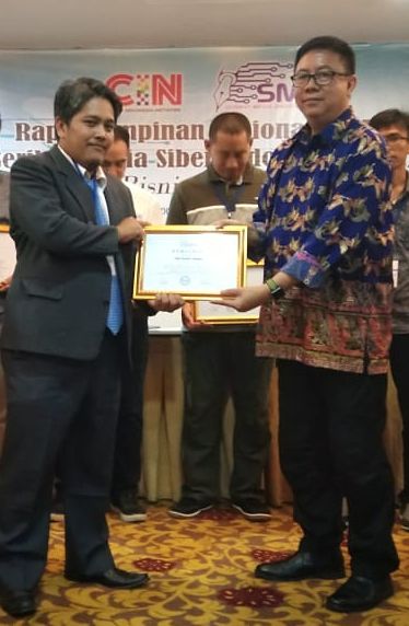 Penghargaan diserahkan oleh Ketua Dewan Pers Yosep Stanley Adi Prasetyo kepada Wakabid Organisasi Adolf Ayatullah Indrajaya yang mewakili Ketua SMSI Lampung Donny Irawan.